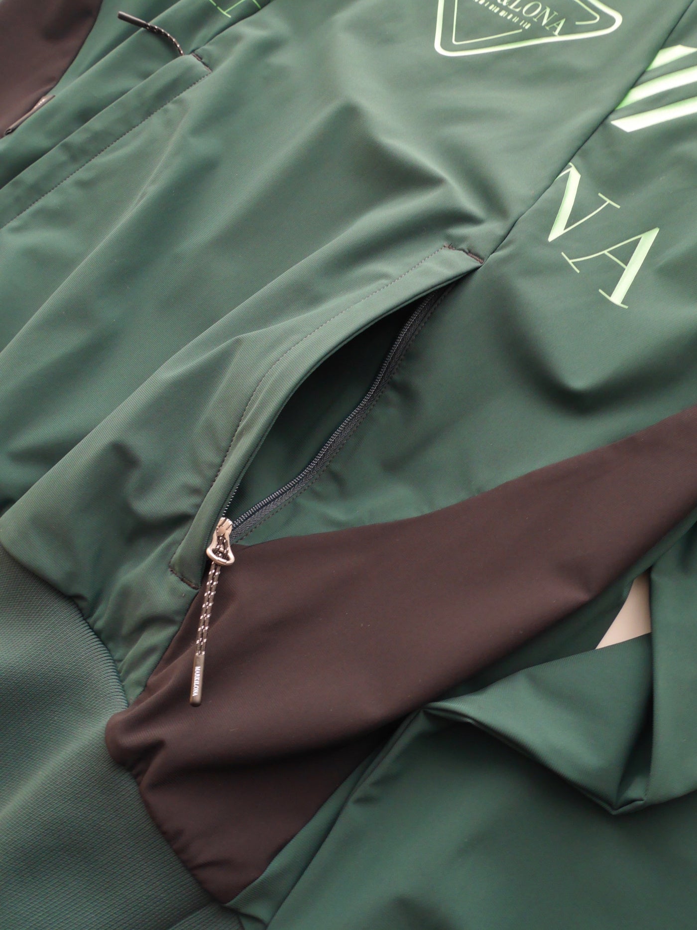 表地:ナイロン71%,ポリウレタン29% 背裏:ポリエステル100% リブ/襟:ポリエステル100% 袖口/裾:ポリエステル92%,ナイロン7%,ポリウレタン1%