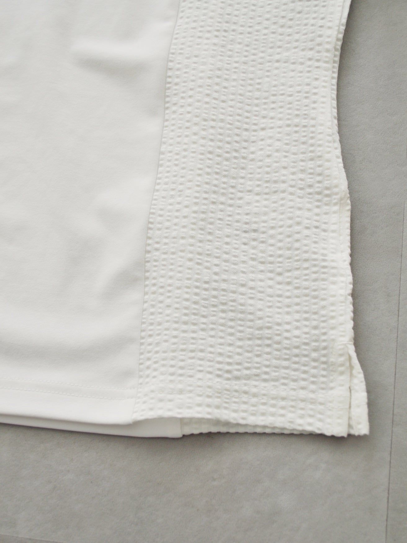 ボディと衿、肩の切り替えには接触冷感、UVカット機能を兼ね備えたスムース素材、サイドパーツには涼感を持たせるためにコットンライクラのニットサッカー生地を使用。