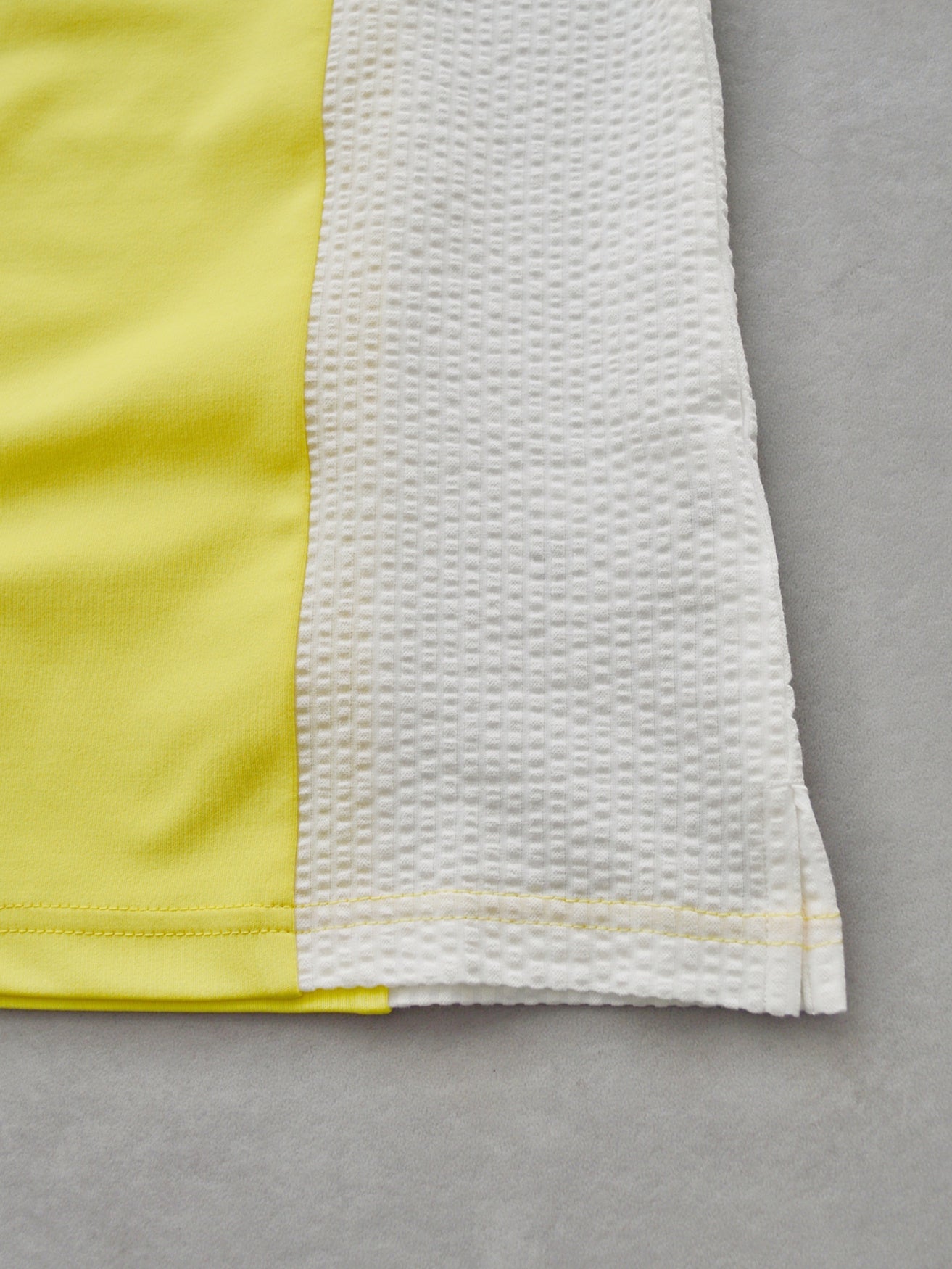 ボディと衿、肩の切り替えには接触冷感、UVカット機能を兼ね備えたスムース素材、サイドパーツには涼感を持たせるためにコットンライクラのニットサッカー生地を使用。