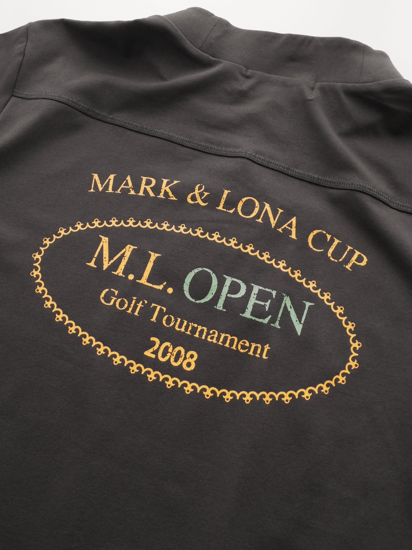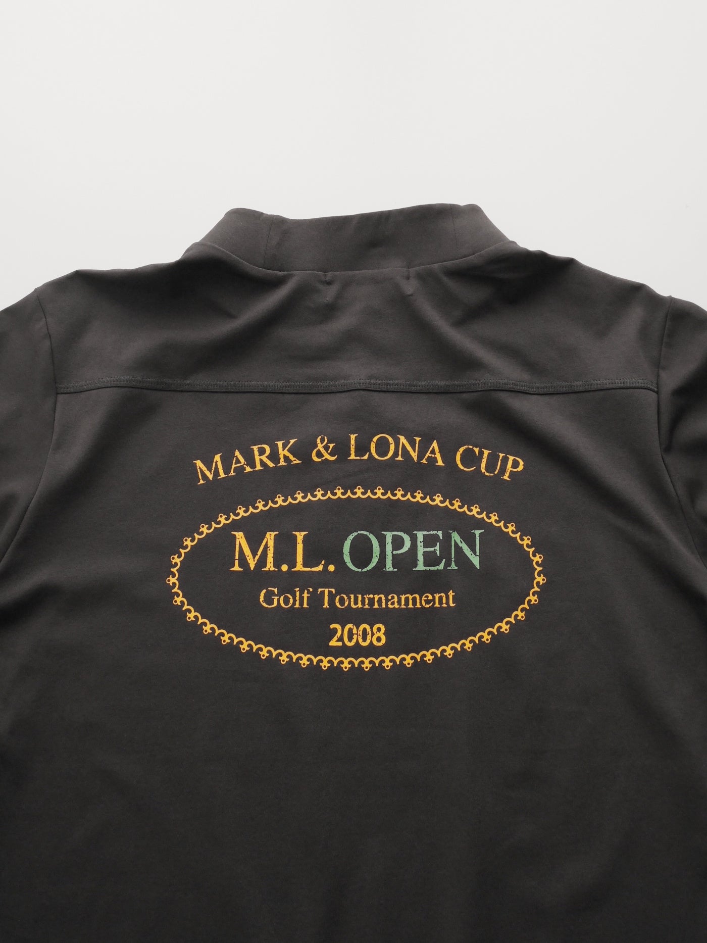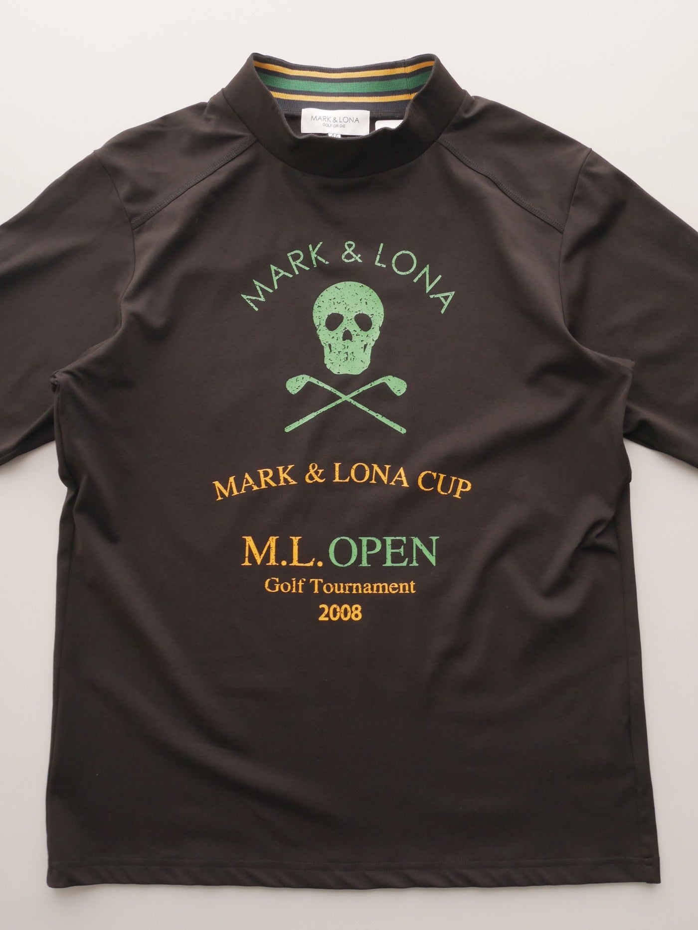 ゴルフトーナメントをモチーフにしたプリントのロングスリーブモックネックシャツ。