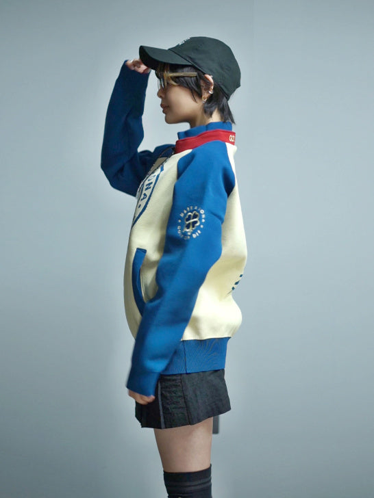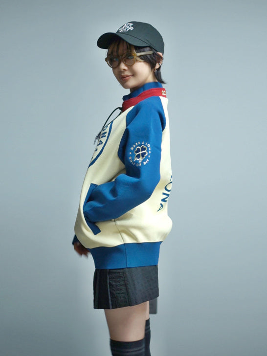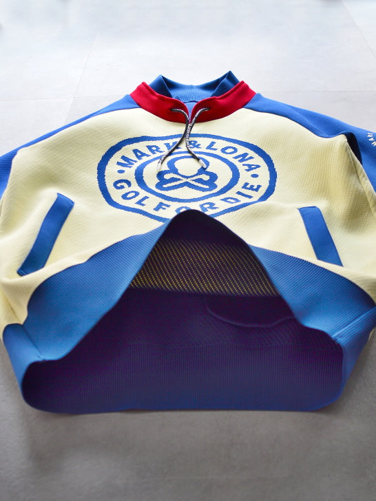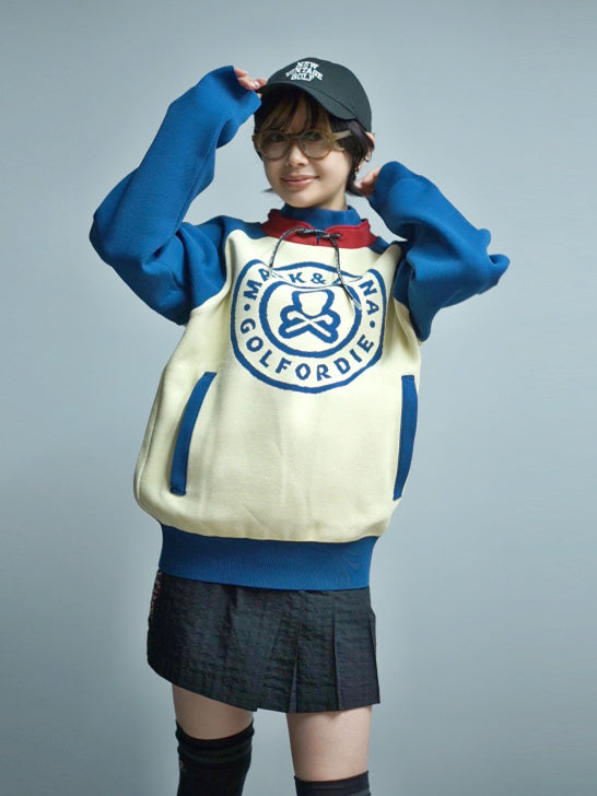 軽量でハイストレッチなポリエステル素材を使用した変形モックニットプルオーバー。