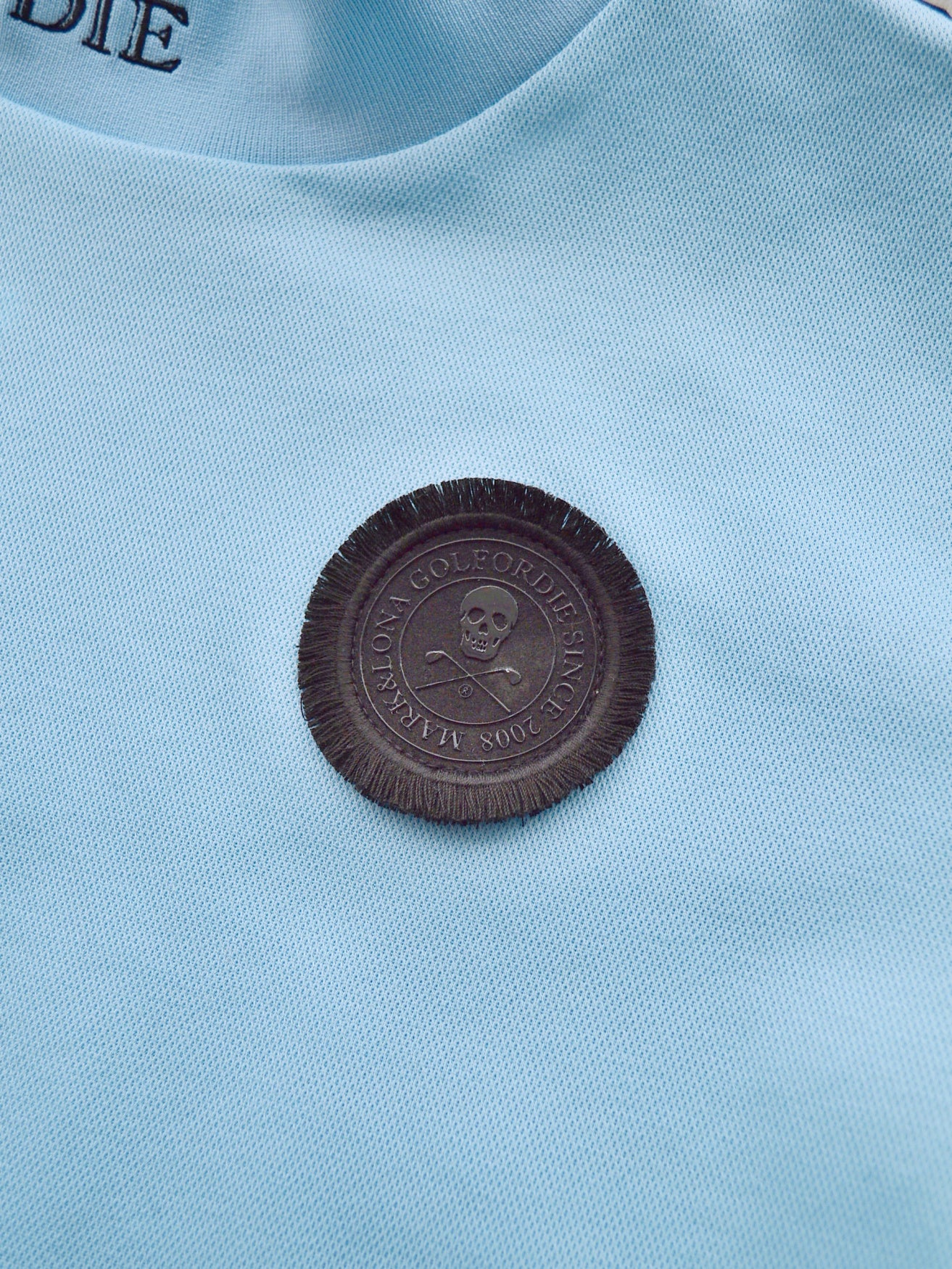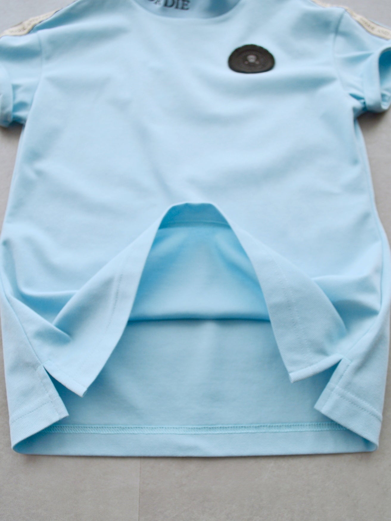 ショルダーに施したサテンテープディテールが目を惹くシンプルなモックネックTシャツ。肩を若干ドロップさせ、身体のラインに沿ったレギュラーフィットシルエット。フラットな内側には吸水性が高く肌触りの良いポリエステル、外側には放湿性が高くソフトな風合いが特徴のコットンで構成した鹿の子素材を使用。フリンジ付きのサークルワッペンがポイントです。